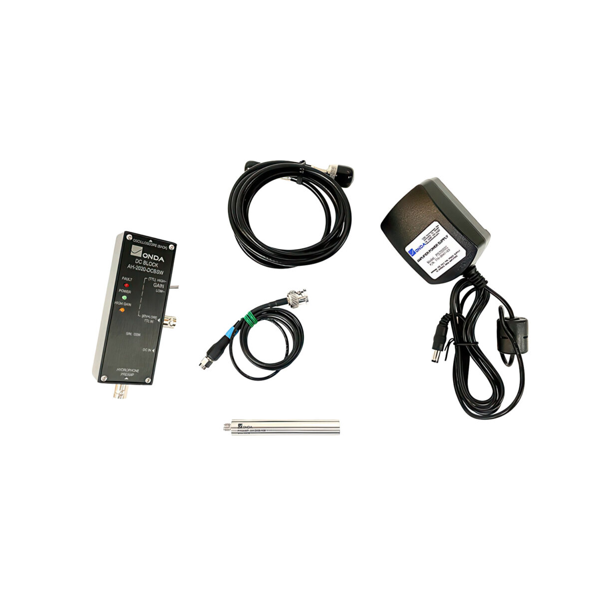 The scope of delivery of the Hydrophon preamplifier and accessories includes a comprehensive set of components, including power supply, DC block, coaxial cable, adapter and a calibration certificate. The hermetically sealed stainless steel housing ensures a long service life even with intensive use. Thanks to the traceable calibration supplied, measurement results can be reliably documented and compared. All in all, the AH-20×0 preamplifiers offer a professional and sophisticated solution for precise ultrasonic measurements in the laboratory and in development.