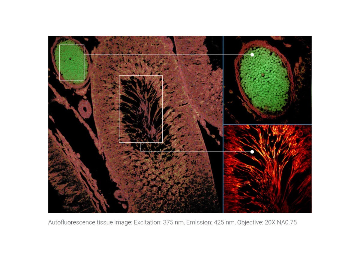 Darüber hinaus ermöglichen galvanometrisch gesteuerte Spiegel oder eine piezo-gesteuerte XYZ-Stage eine hochpräzise Abtastung der Probe. Auch die separaten konfokalen Lochblenden für jede Emissionswellenlänge bieten eine exakte Kontrolle der Bildgebung. Schließlich erleichtert das System die Integration mit verschiedenen Mikroskoptypen führender Hersteller (Nikon, Olympus, Zeiss, Leica) für maßgeschneiderte Forschungsanforderungen.